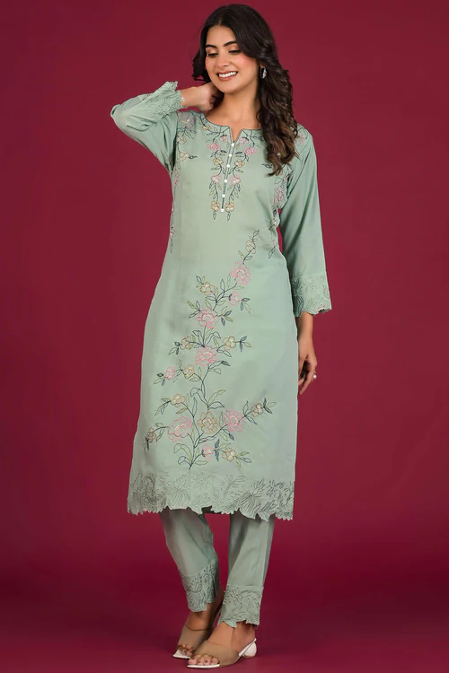 Pista Green Floral Embroidered Chanderi Top Bottom Set
