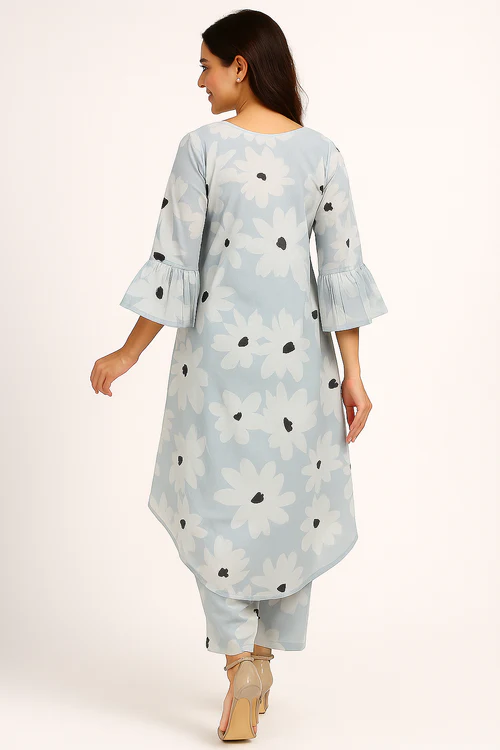Powder Blue Floral Cotton A-Line Kurta with Matching Bottoms