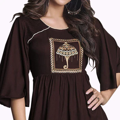 Prominent Dark Brown Colored Partywear Embroidered Rayon Western Top