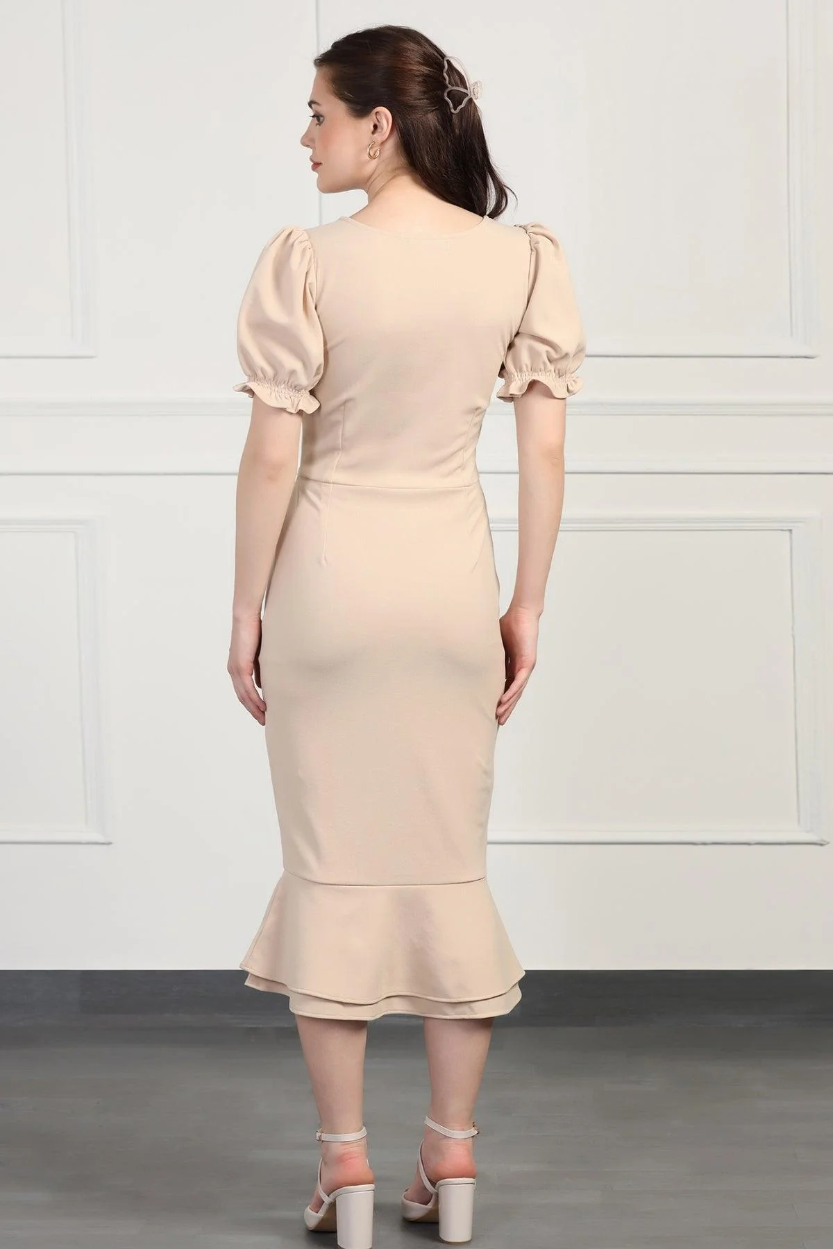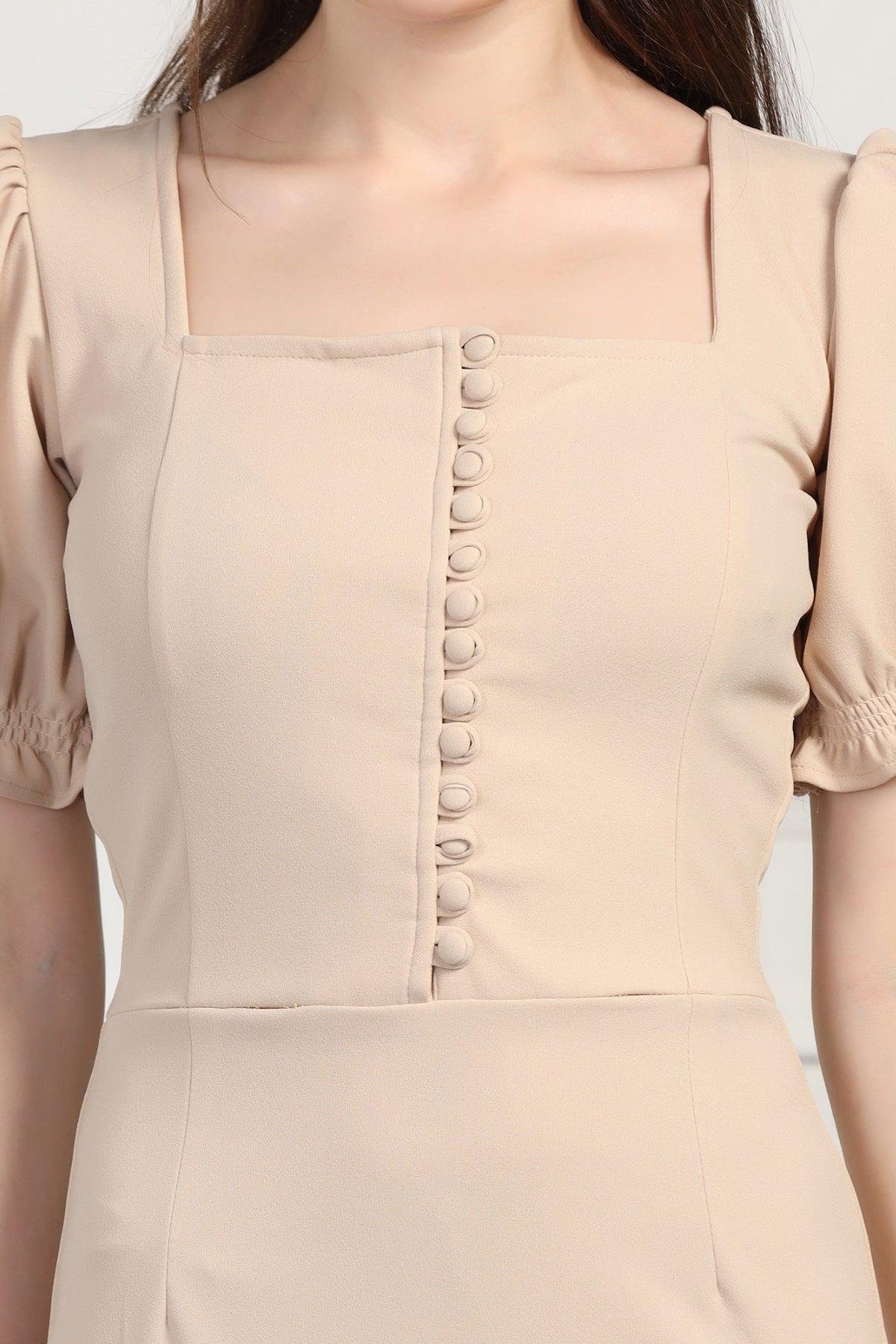 Product Details: Step into elegance with this Cream Midi-Length Dress. The fitted silhouette, combined with short puff sleeves and a square neckline, creates a classic and sophisticated look. The row of decorative buttons running down the center front adds a unique touch, while the cinched waist and flared hem create a flattering, mermaid-like effect. Made from a crepe fabric, this dress offers a comfortable fit that’s perfect for semi-formal to formal occasions. The flounce at the hem adds a playful and feminine touch, making this dress a must-have for any fashion-forward wardrobe.