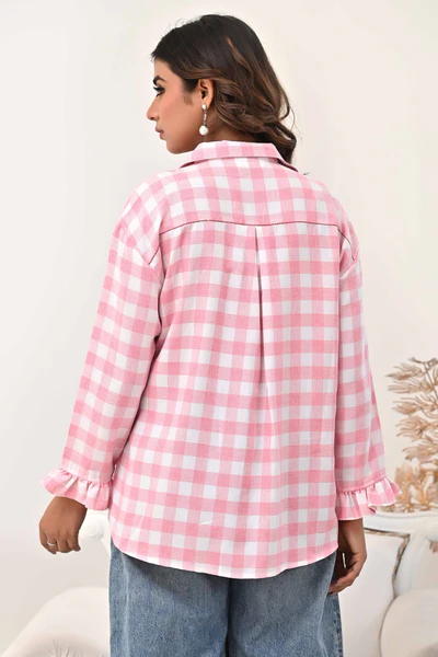 Pure Cotton Peach Top with All-Over Checks and Detailed Floral Embroidery
