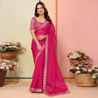 Rani Pink Sequins Embroidered Embroidered Organza Saree