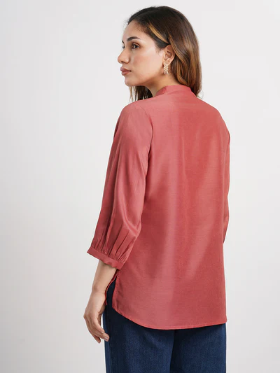 Trendy Red Floral Muslin Shirt Top With Smart Collared Neck & Button Down Front