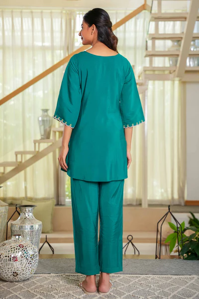 Refreshing Dark Sea Green Chinon Straight Co-Ord Set Adorned With Floral Sequins Embroidery