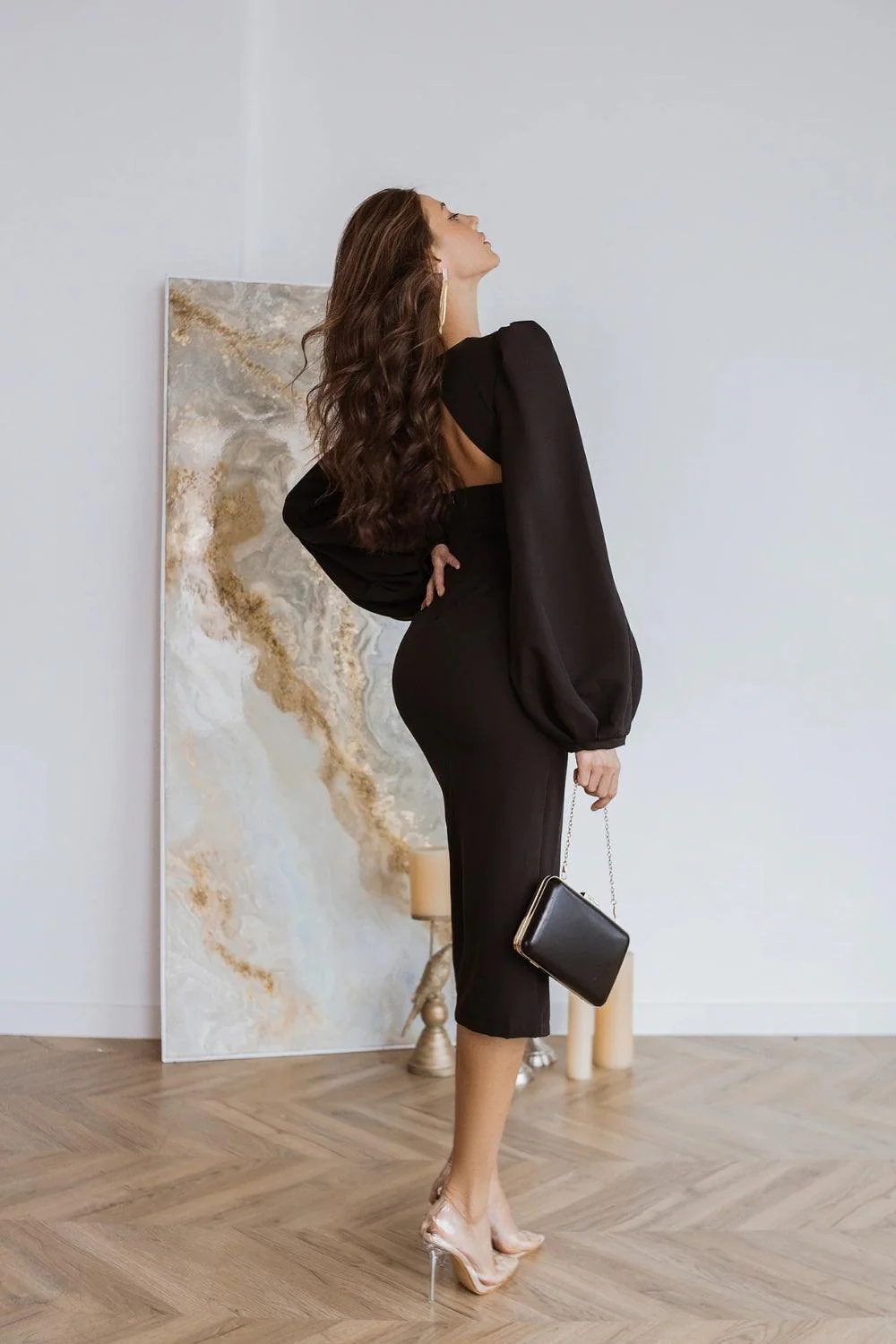 Scarlet – Puff Sleeves Midi Dress in Black