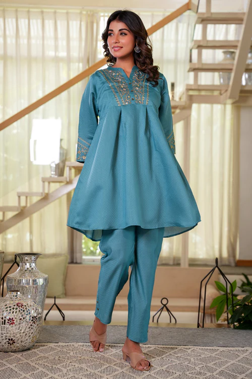 Sea Green Co-Ord Outfit in Viscose Fabric with Neck Embroidery Accent