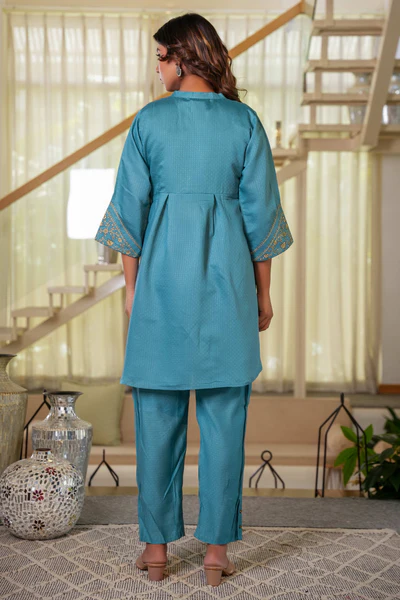 Sea Green Co-Ord Outfit in Viscose Fabric with Neck Embroidery Accent