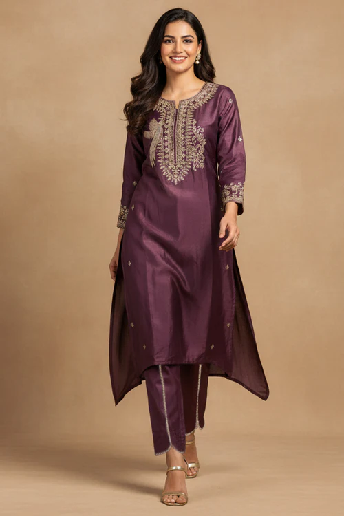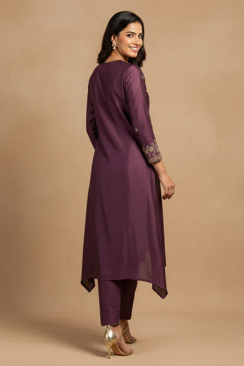 Shimmering Wine Co-ord Set in Viscose Blend with Embroidered Detailing