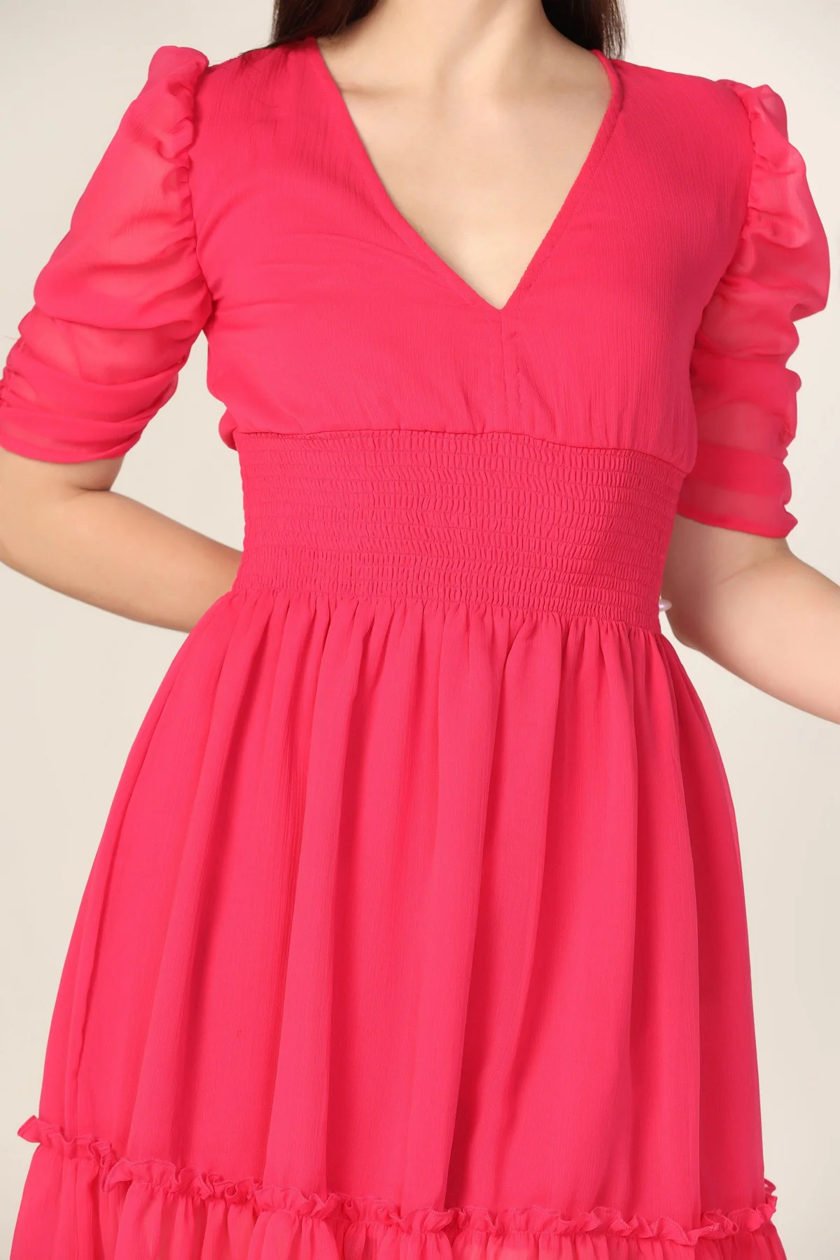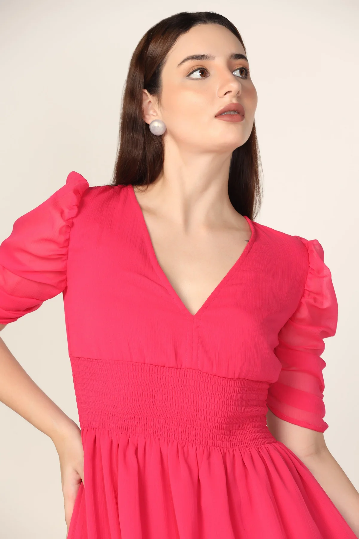 Product Details: This Chic floral skater dress in hot pink features V-Neckline with short puffed sleeves and smocking at the waist. This georgette short dress is perfect for Sunday brunches, picnics and vacations. Style this dress up with a pair of nude footwear, gold dainty jewellery and a cute small bag to complete the Chic look.