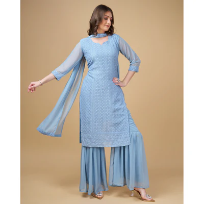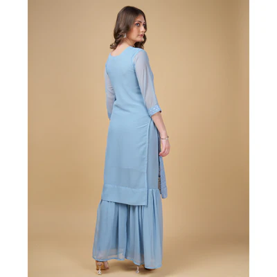 Sky Blue Embroidered Georgette Kurti Sharara Suit
