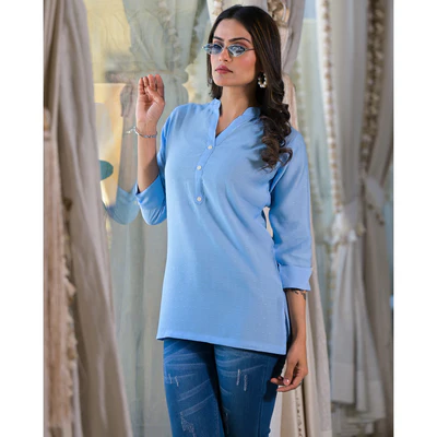 Sky Blue Solid Cotton Silk Straight Top