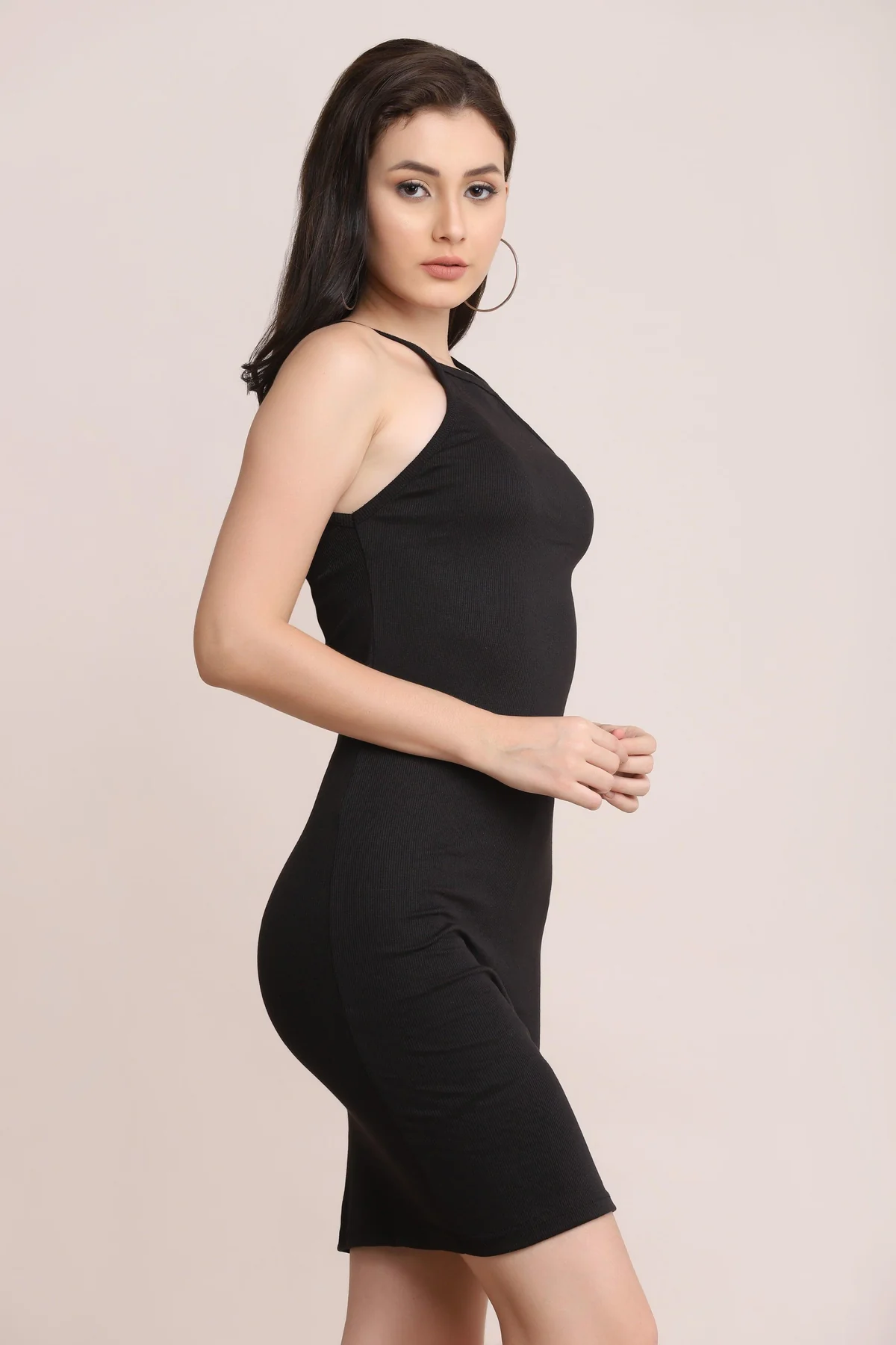 Short Bodycon Ribbed Dress With Spaghetti Straps.