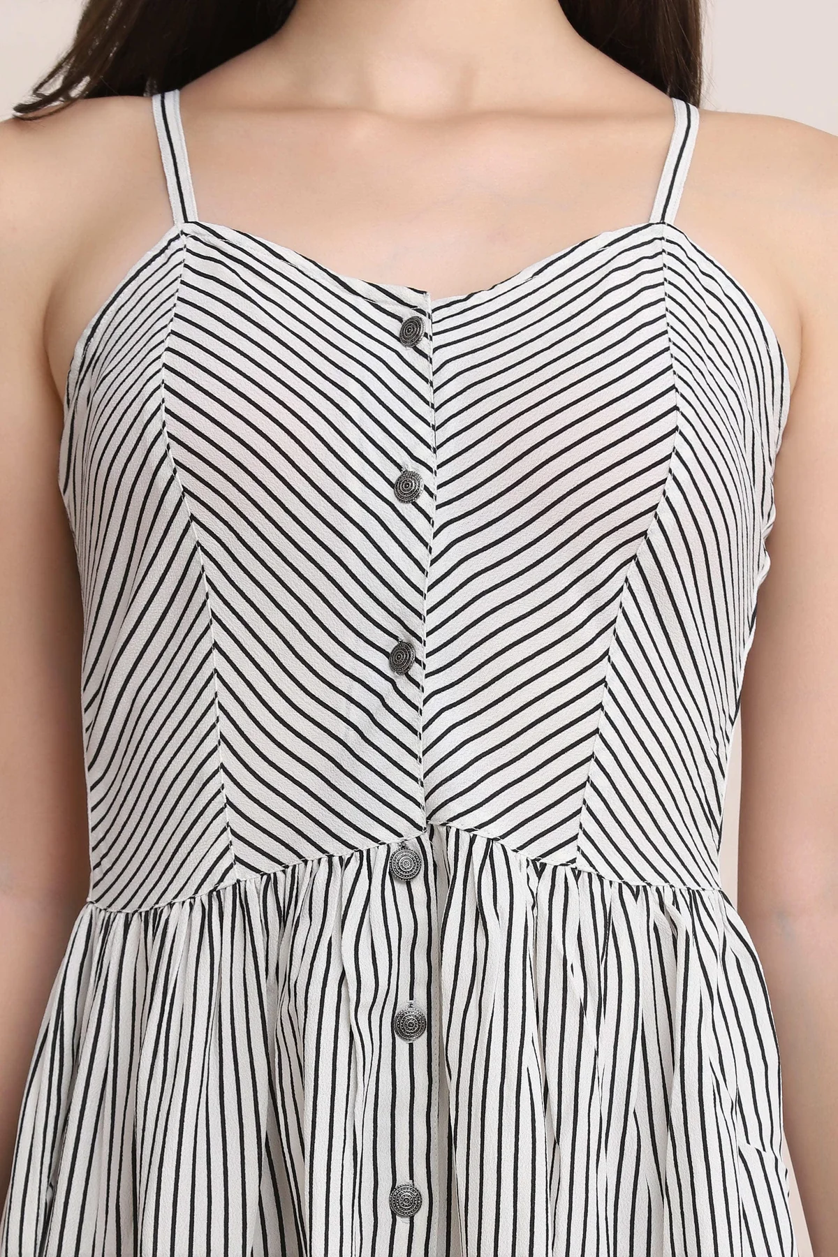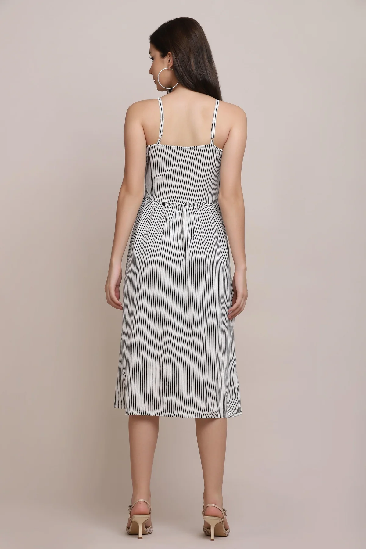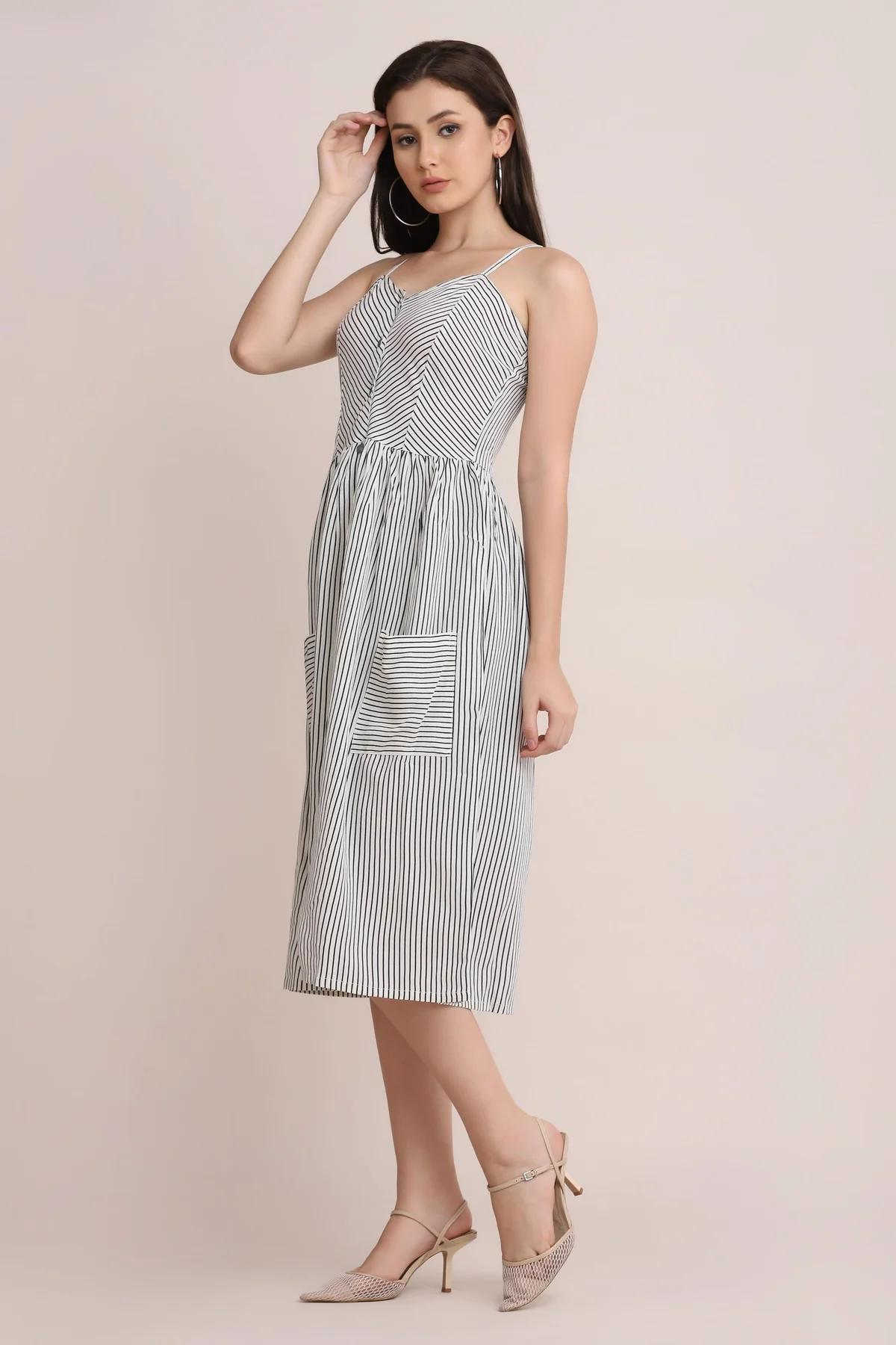 Black & white striped midi dress with V-neckline, buttons on the front and front pockets.