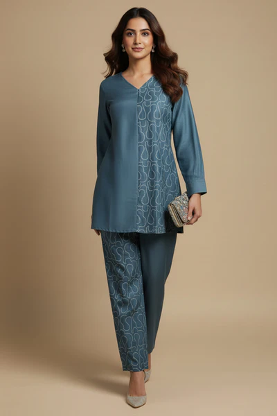 Stylish Teal Modern Print Silky Silk Top Bottom Set for Parties and Events