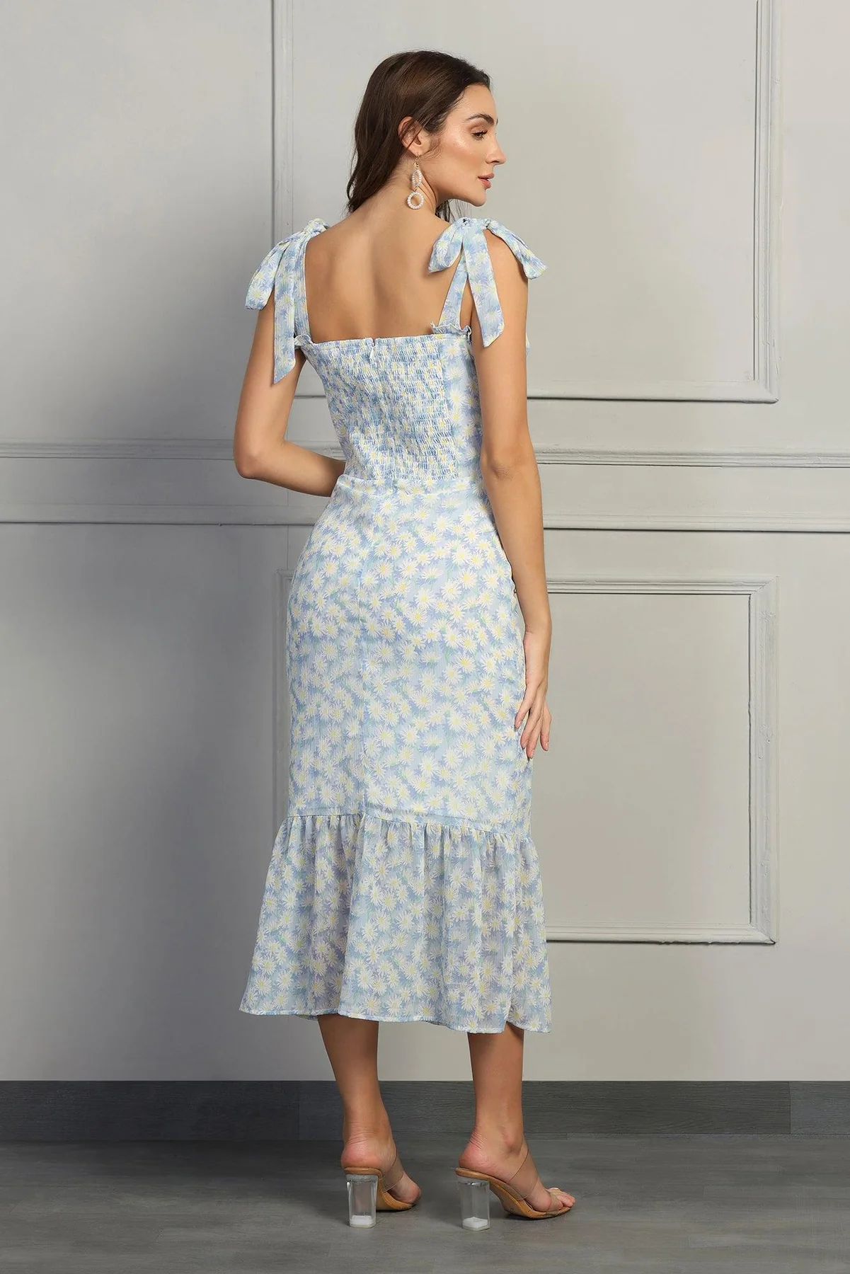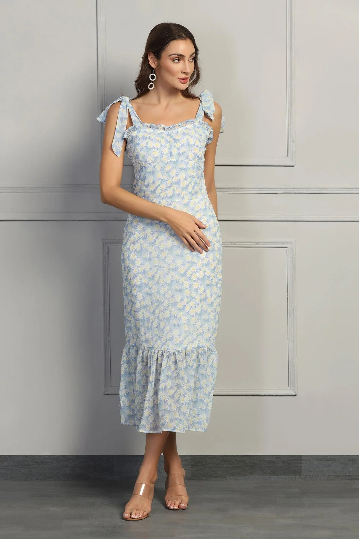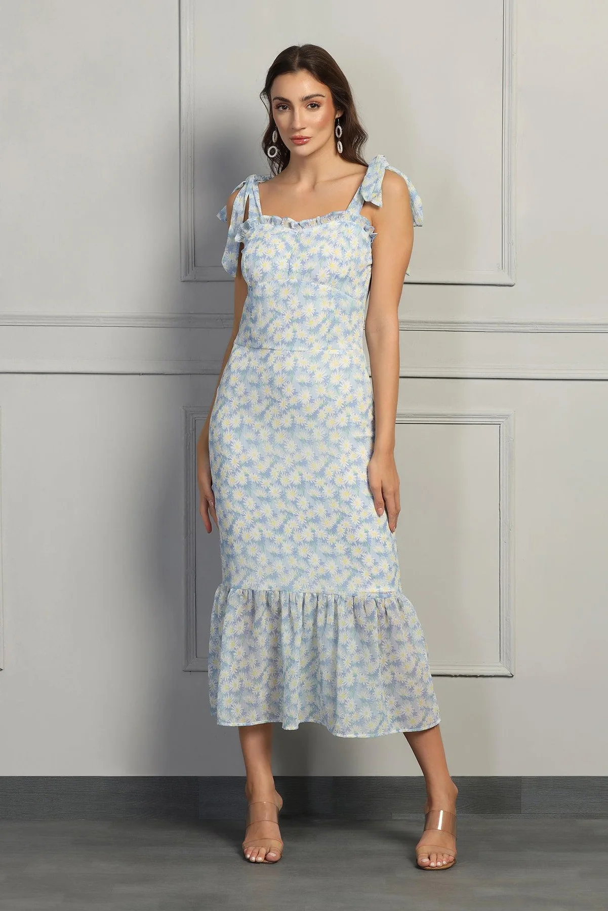 Experience the breezy elegance of this Floral Midi-Length Chiffon Dress. The dress features a beautiful floral pattern in shades of blue and yellow, perfect for a summery day out. The square neckline and shoulder straps that tie into bows add a playful and feminine touch. The dress is cinched at the waist for a flattering silhouette and flares out slightly at the bottom with a ruffled hem. Made from light and airy chiffon, this dress is perfect for warm weather or a casual daytime event.