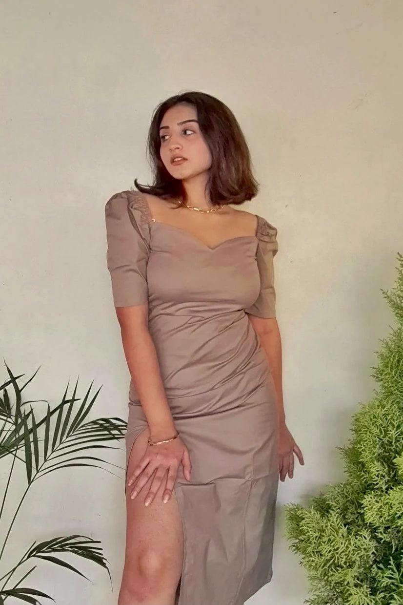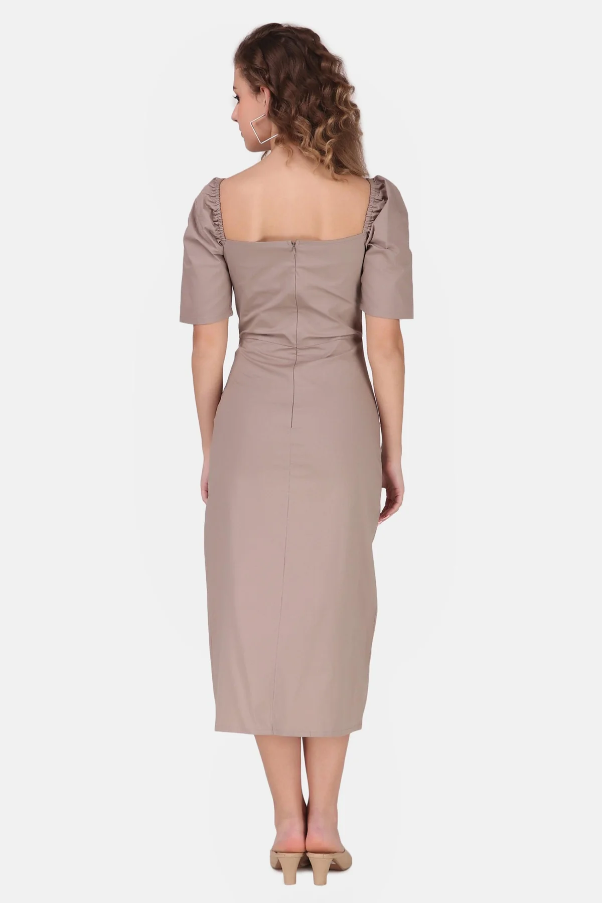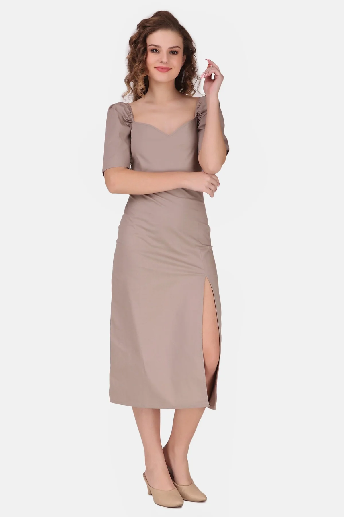 A sweetheart midi dress with side slit, puff sleeves and a zip at the back.