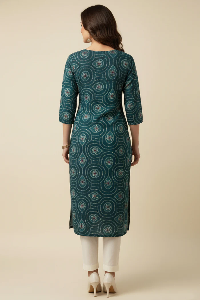 Teal Bandhani Rayon Straight Kurti with Traditional Print