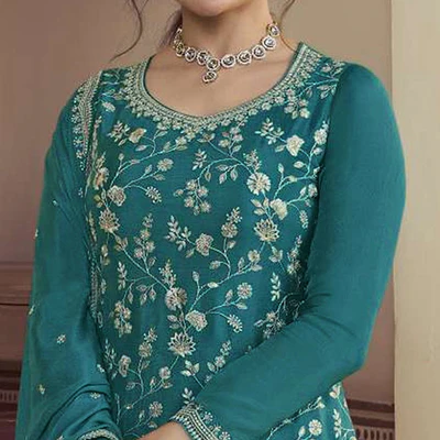 Teal Floral Embroidered Chinon Semi Stitched Sharara Suit