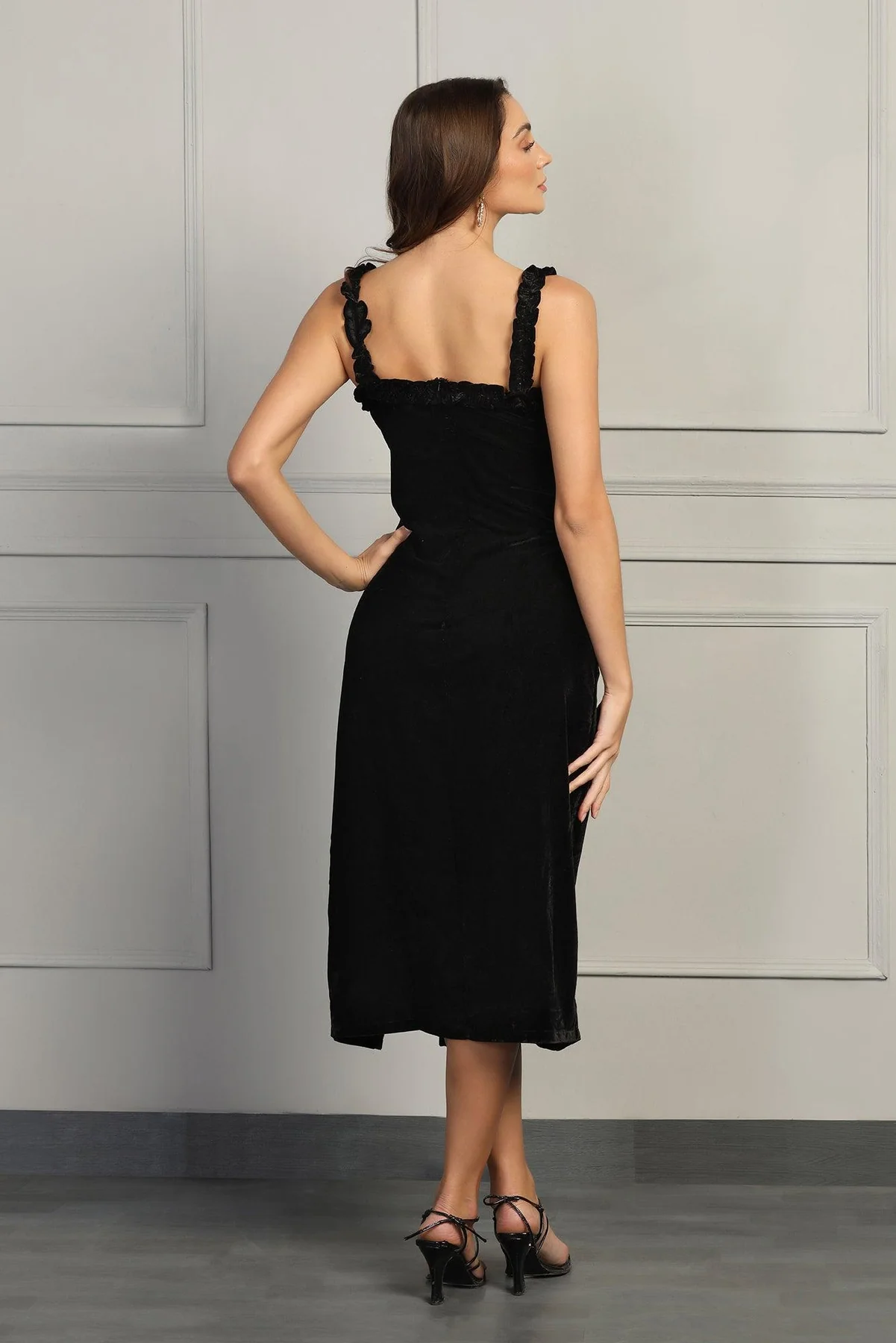 Product Details: Introducing our exquisite Velvet Frill Dress in Black. Adorned with delicate frill detailing on the sleeves and neckline. Featuring a flattering V-neckline, it offers both style and grace. Crafted from luxurious velvet fabric, it promises comfort and luxury.