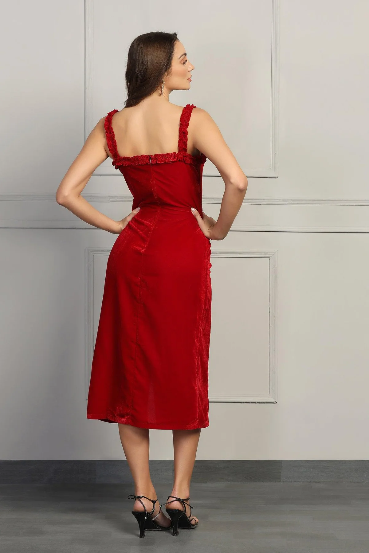Product Details: Introducing our exquisite Velvet Frill Dress in Red. Adorned with delicate frill detailing on the sleeves and neckline. Featuring a flattering V-neckline, it offers both style and grace. Crafted from luxurious velvet fabric, it promises comfort and luxury.