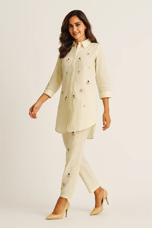Viscose Cambric Cotton Two-Piece Set in Off White with Fine Embroidery