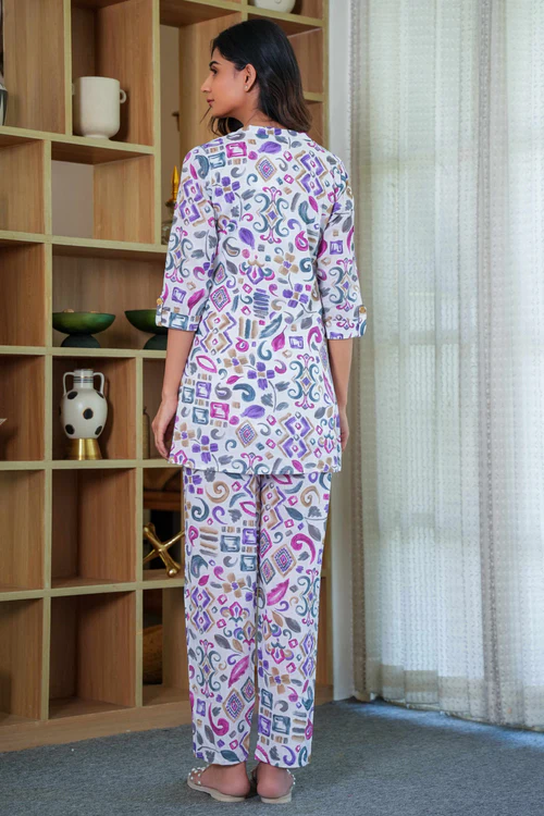 White and Purple Abstract Pattern Angrakha Style Co-Ord Set in Soft Cotton Fabric
