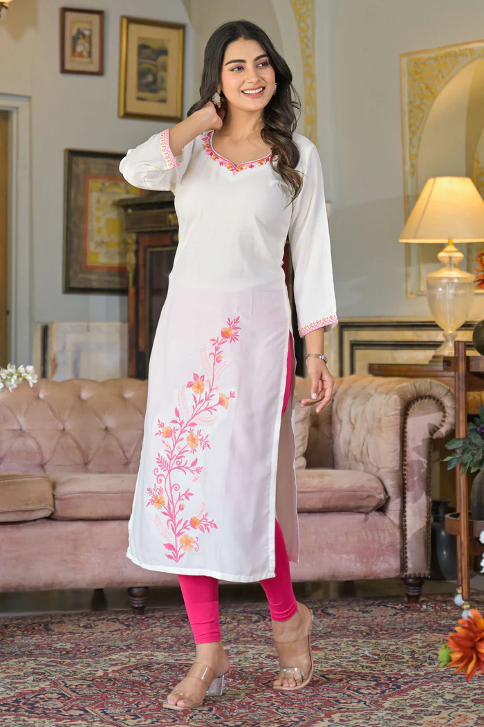White Floral Embroidered Viscose Rayon Straight Kurti