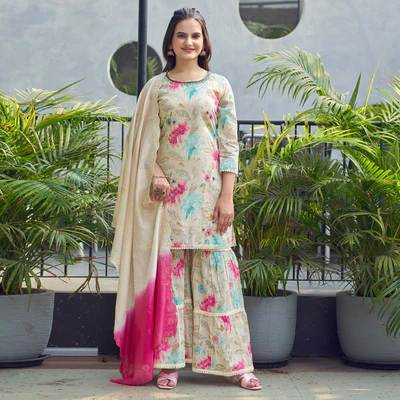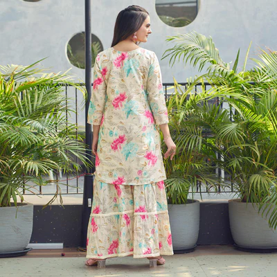 White Floral Foil Printed Mulmul Cotton Sharara Suit