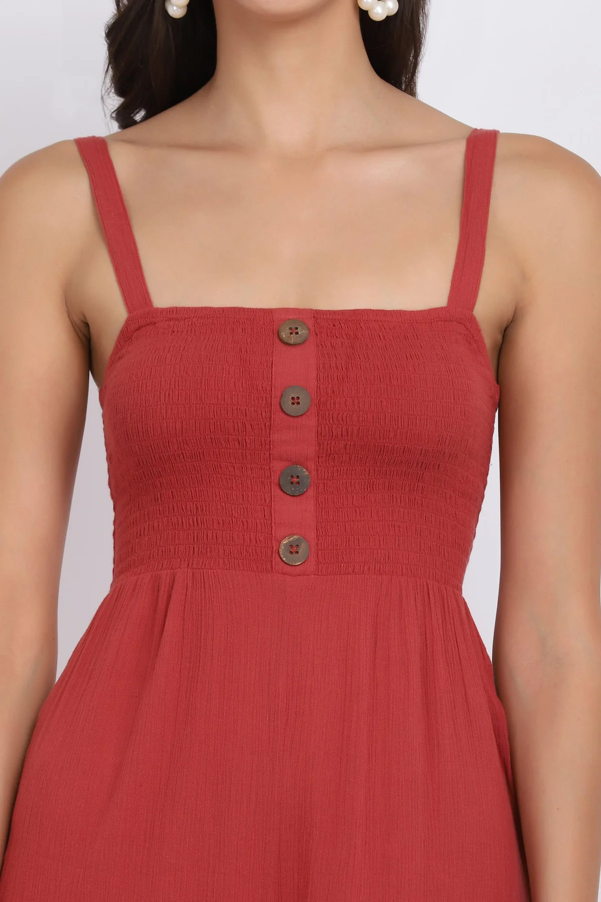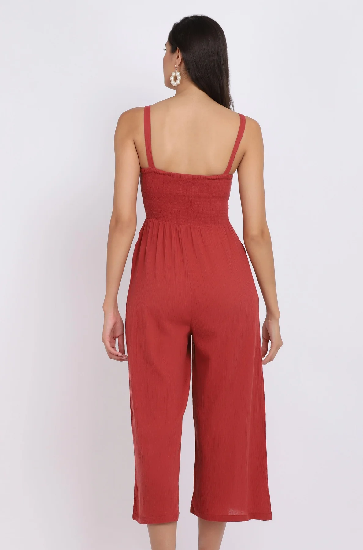 Sleeveless Wide-leg jumpsuit with smocking on the upper half and buttons on the front.