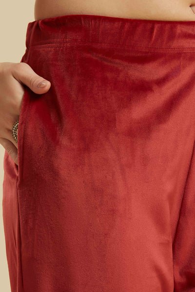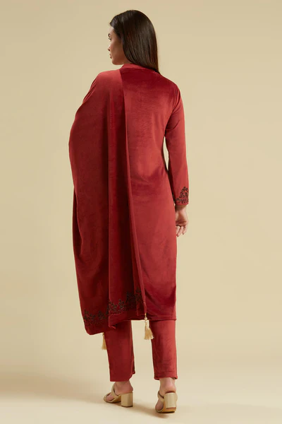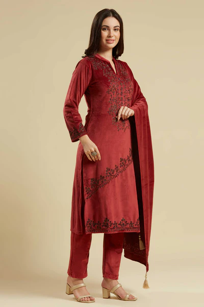 Wine Embroidered Velvet Straight Salwar Suit