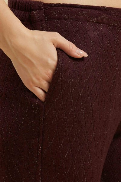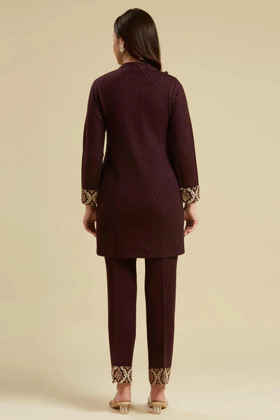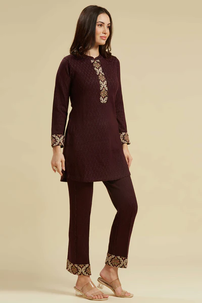 Wine Woven Woolen Straight Top Bottom Set