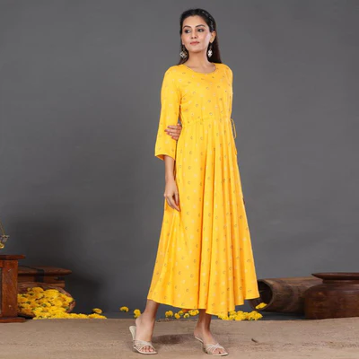 Floral Printed Mustard Capsule Rayon Kurti in Straight Fit