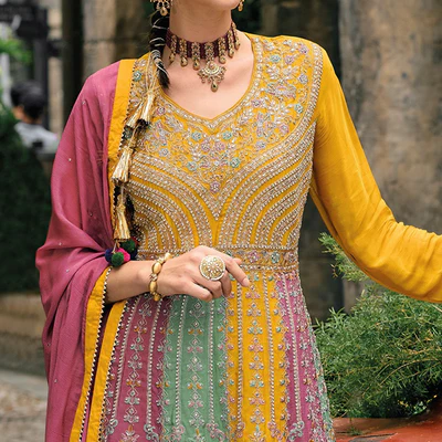 Yellow Embroidered Chinon Semi Stitched Sharara Suit