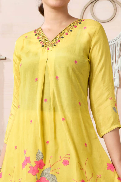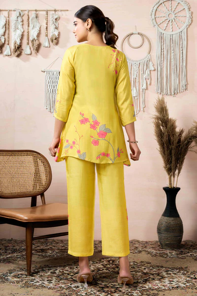 Yellow Floral Digital Print With Handwork Muslin Co-Ord Set